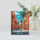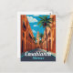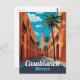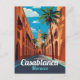 A vibrant, retro-style travel poster illustration of a street scene in Casablanca, Morocco. The image features a narrow street lined with tall, orange-hued buildings and several prominent palm trees leading toward the historic clock tower (Tour de l'Horloge). The sky is bright blue with scattered white clouds. The bottom section is dark blue with the city's name "Casablanca" in large white script and "Morocco" below it.