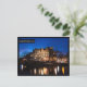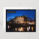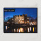 Postal de las antiguas casas románticas de la ciudad de Ámsterdam, construidas a lo largo del canal Prinsengracht, con reflejo de las luces en el agua estancada al comienzo de la noche en la capital de Holanda con un borde negro y el texto 'Ámsterdam'.