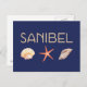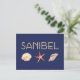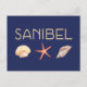Isla Sanibel, Florida conchas de conchas de conchas con acuarela estelar y conchas y el nombre de Sanibel en una fuente deco. El fondo azul puede cambiarse a otro color si lo desea.