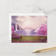 Una postal con una imagen escénica de un lago morado tranquilo. Rodeado de cerezos y cascadas exuberantes.