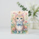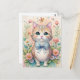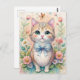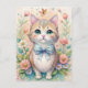 This delightful postcard features an adorable kitten with big green eyes and a pastel blue bow, surrounded by blooming flowers and a fluttering butterfly. Soft watercolor tones of pink, peach, and mint create a gentle, whimsical atmosphere that’s full of charm. Perfect for cat lovers and anyone who enjoys sweet, storybook-style art that brightens the day with warmth and cuteness.