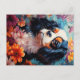 Un retrato de primer plano de un cachorro Cavalier de tricolor, el rey Carlos Español, de estilo pintoresco. El perro tiene un abrigo blanco, negro y marrón, con grandes ojos marrones expresivos. Está rodeado por una abundancia de flores coloridas que crean un ambiente suave y romántico. La piel del perro se representa con un detalle meticuloso, capturando la textura y el flujo de su pelo largo y sedoso. Un regalo perfecto para los amantes de las cavidades.