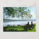 Qué pacífica parece esta pareja sentada en un banco a la sombra en un caluroso día de verano, admirando el hermoso lago Cayuga y disfrutando de la suave brisa. Una rama de sauce suspendida proporciona sombra de adobo. El césped está muy bien protegido del verde y hay algunas nubes en el cielo azul. Esta postal transmite la serenidad del día.