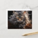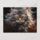 Un retrato de primer plano de un gato de Maine Coon con sorprendentes ojos naranjas, capturado en una pose dramática. La piel del gato es larga y fluida, soplada por un viento invisible, lo que crea un sentido de movimiento y energía. La mirada del gato es intensa y centrada, lo que sugiere una sensación de alerta y poder. El fondo es una extensión oscura y borrosa, resaltando las características del gato y creando una sensación de profundidad. Un regalo ideal para los amantes del Maine coon.