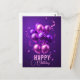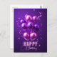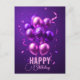 Postal Celebración de cumpleaños con globos púrpura y ros