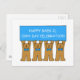 Cuatro ositos de peluche de dibujos animados con corbatas de lazo azules sosteniendo una gran pancarta turquesa que dice 'Celebración Feliz Baek-il 100 días'.