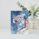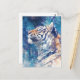 This ethereal postcard features a majestic tiger gazing upward toward a shimmering night sky. Rendered in a stunning watercolor style, the tiger’s fur blends seamlessly with a wintry palette of indigo, teal, and soft amber. The background reveals a deep blue forest under a canopy of stars and geometric light crystals. Intricate paint splatters and bleeding textures create a magical, dreamlike atmosphere that captures the spirit of the wild under a cosmic glow. This postcard is a perfect choice for sending a soulful message, a unique birthday wish, or as a striking piece of miniature wall art for nature and fantasy enthusiasts.