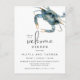 El boda perfecto recibe la invitación a cenar en la costa, con un cangrejo azul en la esquina superior con acuarelas vibrantes impresas en una postal. La combinación de textos de invitación es moderna con una elegancia informal que es a la vez de buen gusto y hospitalaria. Personalice la plantilla de texto con sus detalles específicos. Esta invitación es una excelente elección para cenas en las zonas costeras o cenas con marisco.