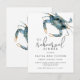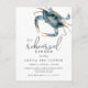 La invitación perfecta para la cena de ensayo de la boda para cenas a lo largo de la costa, este diseño presenta un cangrejo azul en la esquina superior en acuarelas vibrantes impresas en una postal. La combinación de texto de la invitación es moderna con una elegancia casual que es a la vez de buen gusto y hospitalaria. Personalice la plantilla de texto con sus detalles específicos. Esta invitación es una excelente opción para cenas de ensayo en áreas costeras, o cenas donde se sirve mariscos.