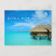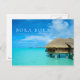 La postal de la foto con un overwater de la luna de miel cubrió con paja la casa de planta baja en un centro turístico de lujo en la laguna azul clara de la isla del Pacífico de Bora Bora, cerca de Tahití en el archipiélago de Polinesia francesa con el texto: "Bora Bora, Polinesia francesa".