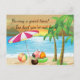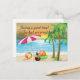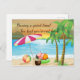 Tranquila escena tropical de playa con sombrilla, un bonito cerdo durmiendo en un tubo interior. Tiene una bebida de coco sentada a su lado y palmeras a la derecha. Cualquier texto es fácil de eliminar o cambiar