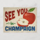 Una encantadora postal de viaje vintage de Champaign Illinois con una hermosa manzana roja, junto con un divertido texto de estilo retro que dice: "Nos vemos en Champaign"