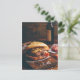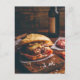 Cheeseburger con queso patty de ternera, queso musculoso, jamón, setas salteadas, mostaza de dijon, mayonesa y rollo de papa. Botella de cerveza de artesanía y porción cruda en el fondo.
