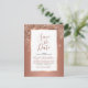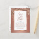 Invítelos a guardar la fecha de su evento especial con estas hermosas tarjetas postales. Este diseño elegante presenta texto en rosa dorado y gris dentro de un elegante marco de lámina de cobre rosa dorado metálico, con gotas de brillo y un fondo de cobre rosa dorado en la parte delantera y plantillas para su nombre, dirección de devolución y mensaje opcional en la parte posterior de la tarjeta.