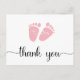 Gracias por tu postal por tu ducha de bebé con "gracias" en un guión elegante con toques y una acuarela rosa con pies de bebé. En la parte posterior, personaliza tu mensaje de agradecimiento o deja en blanco una nota manuscrita.