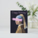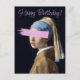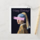 Chica con pendiente de perla con un toque de pincel rosa. Feliz cumpleaños.