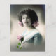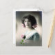 Fotografía vintage, parcialmente coloreada, de una joven con un vestido azul y rosas rosadas en su cabello. Ella lleva un solo rosa de tallo.