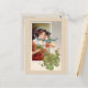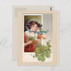 Esta foto muestra a un joven chica con una bufanda en una ventana, agarrando un ramo de rocas de champú en el Día de San Patricio. El saludo de la tarjeta en un trébol de cuatro hojas dice Erin Go Bragh - Ireland Forever.