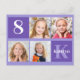 Tarjeta postal de invitación de cumpleaños cuadrada de 4 fotos para una niña. Celebre el cumpleaños de su hijo con adorables fotografías de ellos en esta tarjeta postal con su propia fotografía con bonitos cuadrados morados. Agregue su nombre y edad.