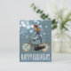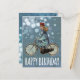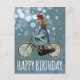 Chica de bicicleta antigua - lleva una gorra roja y vestido azul. Imagen gráfica antigua con grandes detalles. Viene con luces de bokeh azules como fondo y las palabras "Feliz Cumpleaños" en letras blancas. Tarjeta postal para una chica amante de la bicicleta. Impreso en ambos lados. Puedes agregar tus palabras / monogramas / imagen, etc.