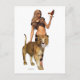 Este diseño presenta una imagen fantástica de una hermosa y antigua reina guerrera dando un paseo con sus compañeros, una leona dorada y un pequeño pájaro rojo.