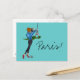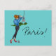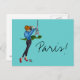 Un chica en París tomando una foto de la Torre Eiffel. "¡París!" está escrito al otro lado del frente.