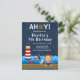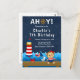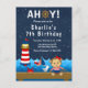 Esta invitación linda y divertida presenta a una mona marinera náutica en una cubierta de madera con una gaviota y un cangrejo. En el fondo hay un faro rojo y blanco, un pájaro lindo en un velero, olas del océano y un cielo nocturno estrellado de azul marino. El texto combina fuentes en negrita y serif para un look elegante y moderno. Esto es perfecto para una fiesta de cumpleaños con tema náutico.