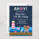 Esta invitación linda y divertida presenta una osa marinera náutica en una cubierta de madera con una gaviota y un cangrejo. En el fondo hay un faro rosa y blanco, un pájaro lindo en un barco de vela, olas del océano y un cielo nocturno estrellado azul marino. El texto combina fuentes en negrita y serif para un aspecto elegante y moderno. Esto es perfecto para una fiesta de cumpleaños con tema náutico.