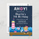 Esta encantadora y divertida invitación incluye un mono marinero chica en una terraza de madera con gaviota y cangrejo. Al fondo, un faro rosa y blanco, un bonito pájaro en un velero, olas del océano y un cielo estrellado azul marino. El texto combina fuentes audaces y serif para un estilo elegante y moderno. Es ideal para una fiesta de cumpleaños con temática náutica.