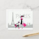 Este diseño de París, Francia, cuenta con un chica y un paseo de cangrejos en París con bolsas de compras. La decoración es rosa, negra y gris.