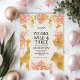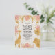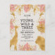 Esta postal "joven, salvaje y tres" con la temática de safari en la jungla de tercer cumpleaños incluye animales de Relieve metalizado falsos de oro (jirafa, león y monos), follaje de oro y jungla rosa, y una rociada de confetti de oro en un fondo crudo. Agregue el nombre del chica de cumpleaños y los detalles del fiesta en texto negro y su dirección de retorno al revés.