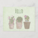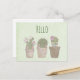 Una postal de hola con un diseño caprichoso. 3 coquetos cactus todos seguidos con caras sonrientes sentados en una maceta de flores cada uno con joyas.