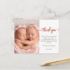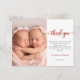 Elegante Chica De Guión Fotográfico Gemelos Recién Nacidos Gracias Postcard. Presentando un texto simple moderno y hermoso de "gracias" en un cursivo guión corto de caligrafía manuscrita con cola de batida en falso Relieve metalizado de oro rosa (o Relieve metalizado rosa rubor) y un mensaje personal prehecho Genial para la niña. Fácil de personalizar con las fotos y detalles de tu bebé.