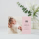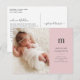 Esta postal de anuncio de nacimiento rosa presenta un diseño moderno de moda. La parte delantera de la postal incluye una gran foto cuadrada a la izquierda y un texto simple y minimalista a la derecha. El texto gris oscuro del carbón vegetal se muestra en un fondo rosado bonito. Personalizar con el nombre inicial, primero y medio de su bebé, fecha de nacimiento, detalles de nacimiento y sus nombres. En la parte posterior, puede escribir un mensaje personal a los destinatarios.