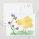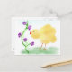 Pintura de un pequeño polluelo amarillo oliendo flores moradas. ©janet Palaggi