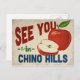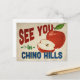 Una encantadora postal de viaje vintage de Chino Hills California con una hermosa manzana roja, junto con un divertido texto de estilo retro que dice, "Nos vemos en las colinas de Chino"