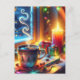 postal de navidades. Escena de Navidades en la ventana de un bonito con una taza caliente de chocolate caliente al vapor, velas encendidas en una noche nevada. Mientras la nieve cae en esta noche mágica, les deseo todo alegre y brillante. Postal de vacaciones personalizada dulce para darle un ambiente cálido y acogedor.