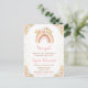 Esta linda y caprichosa invitación para baby shower presenta un arcoíris boho, confeti y arreglos florales con hierba de pampas en tonos neutros beige, rosa y marrón. El texto combina fuentes manuscritas y sans serif para una apariencia elegante y moderna. Esto es perfecto para una baby shower de primavera o verano.