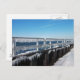 La foto escénica muestra glóbulos blancos, vientos y congelados. Están colgando de una barandilla y un mamparo metalizado. Se puede ver nieve frente al mamparo. El agua azul de la bahía y el cielo azul se ven al fondo. Esta foto panorámica del paisaje fue tomada en el extremo norte de Long Beach Island en Barnegat Light, Nueva Jersey.