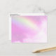 Postal con un bonito fondo. Un cielo rosa pastel con nubes esponjosas y un arcoiris de color limón. Diseño mágico y caprichoso.