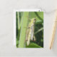 Esta postal tiene un cierre de saltamontes verdes sobre un tallo de girasol.