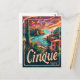 Una vibrante y nostálgica representación de Cinque Terre, Italia, conocida por sus coloridos pueblos al borde del acantilado y sus impresionantes vistas a la costa. El diseño captura las pintorescas ciudades de Monterosso, Vernazza, Corniglia, Manarola y Riomaggiore, encaramadas a lo largo de acantilados escarpados con vistas al mar Mediterráneo. La obra de arte, de estilo vintage, evoca la encantadora y pintoresca belleza de Cinque Terre, invitando a los espectadores a explorar su paisaje único y su atractivo costero.