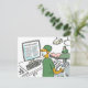 Tarjeta de dibujos animados médicos divertida. Un cirujano asiático está a punto de realizar una operación en un quirófano y está consultando las instrucciones en línea a través de una pantalla de computadora. Humor médico.
