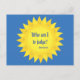 Esta postal contiene una cita del Papa Francisco bajo un sol amarillo sobre un fondo azul. Los colores forman parte del escudo de armas del Pontífice. El texto dice: ¿Quién soy yo para juzgar? Es un ejemplo de la grandeza y humildad de este hombre tan especial.