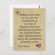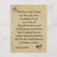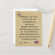 Esta postal tiene un fondo que se parece a un papel viejo. En la esquina superior izquierda está la bandera estadounidense con forma de estrella. En la parte inferior derecha está el diseño de la bandera estadounidense en forma de corazón. Una cita del padre fundador, John Adams dice: "La religión y la virtud son los únicos cimientos verdaderos, no sólo del republicanismo y de todos los gobiernos libres, sino de la felicidad social y bajo todos los gobiernos y en todas las combinaciones de la sociedad humana".