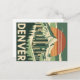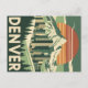 Un afiche de viajes de estilo retro muestra el horizonte de Denver, situado al pie de una gran cordillera nevada bajo un sol de rayas, rodeado de pinos, con "DENVER" en la parte inferior.