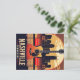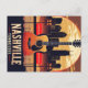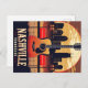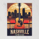 Un afiche de viaje de estilo retro para Nashville, Tennessee, cuenta con una gran guitarra acústica en primer plano, con el perfil de la ciudad protegido contra una vibrante puesta de sol. "NASHVILLE" se muestra de forma destacada sobre "TENNESSEE" en la parte inferior.