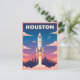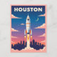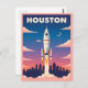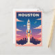 Celebre el legado espacial de Houston con esta colorida postal estilo retro que presenta un lanzamiento de cohetes sobre el horizonte de la ciudad, un vibrante cielo de gradiente de atardecer a noche y una audaz tipografía "HOUSTON", perfecta para coleccionistas, entusiastas del espacio y amantes del arte de viajes vintage.