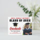 Esta moderna tarjeta de postales y invitación de graduación de la fiesta de graduación de personalizado blanco y rojo presenta una tipografía blanca elegante de su nombre universitario para la clase de 2025. Personalizar con tu año de graduación bajo el guión manuscrito negro de la moda y el gorro negro para grandes postales. Añada los detalles de su fiesta al dorso.