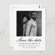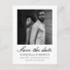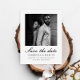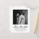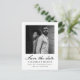 Sencilla y elegante boda en blanco y negro con dos fotos, salvo la postal de invitación de fecha, que incluye un hermoso guión de caligrafía en la parte delantera con una foto, y una segunda foto en forma de arco con detalles del sitio web boda y dirección de retorno en la parte posterior de la tarjeta postal clásica de invitación boda. Compra esta colección de bodas de moda para coordinar invitaciones de boda, y opciones de color modernas adicionales.